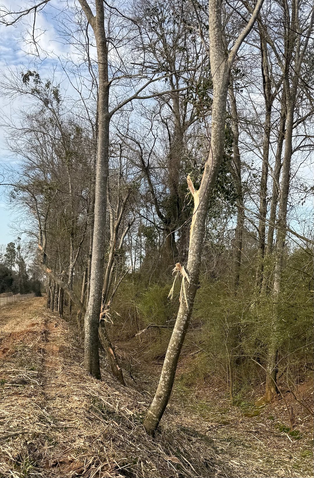 During the project the team worked methodically to stay safe and minimize impact to the surrounding area. Vegetation was mulched in place to reduce hauling and to leave a protective layer on the soil, which can help with erosion control. Because this project took place near a drainage channel, attention to slope stability and existing water flow was important throughout the work.